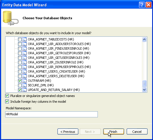 You are now ready to create our Entity Data Model based on HR's DEPARTMENTS and EMPLOYEES tables and the two new stored procedures that you just added. To do so, you will add an EDM to our project. The EDM will be automatically generated using the Entity Data Model Wizard.