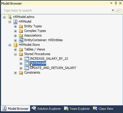 In the Model Browser, expand the HRModel.Store, then expand the Stored Procedures node. Select the OUTPARAM procedure. You imported this procedure earlier when you created the EDM.