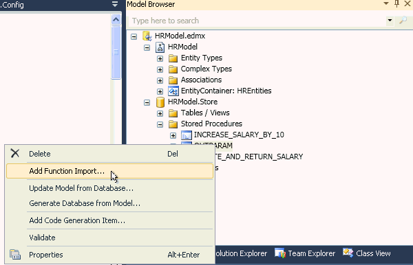 Next, you will use the Function Import tool to map a .NET method to an Oracle stored procedure. Double-click HRModel.edmx and select Model Browser.