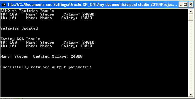 LINQ retrieves the two rows of data and updates each row by executing the stored procedure. You should see text that indicates the salaries have been updated.