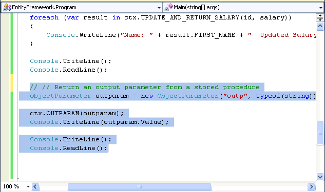 In the Solution Explorerwindow, open the Program.cs file. Type or copy the following code from the Programcs.txt - "Update salary using a stored procedure function import" after the previous code statements. Notice that the entity context now has an UPDATE_AND_RETURN_SALARY method defined. This method will call the mapped stored procedure and return the implicit resulset.