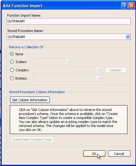 In the Add Function Import window, select None in the "Returns a Collection Of" section. The stored procedure returns an output parameter, not a collection in this case. To call the method from .NET, you will use the default OUTPARAM Function Import name. Click OK.