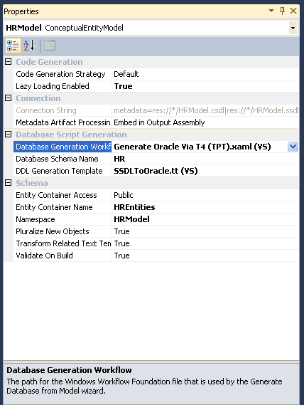 To generate the DDL scripts, open the Properties window of HRModel. Change the Database Schema Name to HR and select SSDLtoOracle.tt for the DDL Generation Template. Make sure that Generate Oracle via T4(TPT).xaml is selected in the Database Generation Workflow property to ensure table per type DDL will be generated. These selections ensure that Oracle DDL is created for the HR schema where each type represents a separate database table.