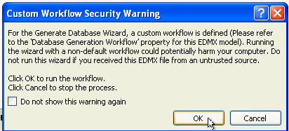 After you select Generate Database from Model, a Custom Workflow Security Warning will appear since Oracle defines a custom workflow. Click OK.