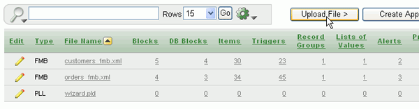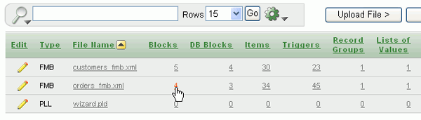 All the files have been uploaded. Although all the files are visible to the project page, most of the columns on the Interactive Report only relate to _fmb.xml files. For example, the Blocks, DB Blocks columns will always have values of 0 for all files except _fmb.xml files. You will review some of the objects for many of the files in later sections of this tutorial.