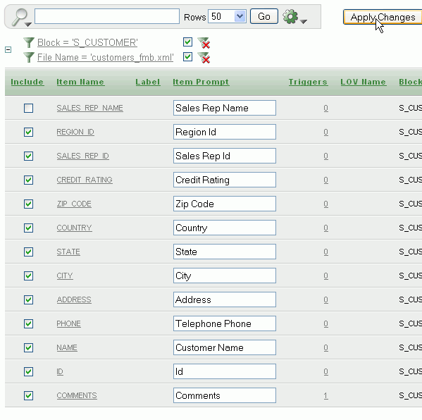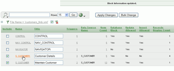 A list of the blocks for the customers_fmb.xml file appear. You can include or not include blocks from this page. Notice that the navigation control blocks are not selected, because they don't have a Data Source Name, so they will not be generated when you create your Application Express Application. You can also change the title of the block when it is generated. Enter Customer Details for S_CUSTOMER1 and Maintain Customer in the title field for S_CUSTOMERand click Apply Changes.