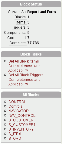 On the right side of the page, in the Block Status region, you see that this block will be converted into a Report and Form when the Application Express Application is created. Note that from this page, under Block Tasks, you can set applicability and completeness for this Block's items and triggers. In addition, you can navigate to another Block by clicking it's name in the list.