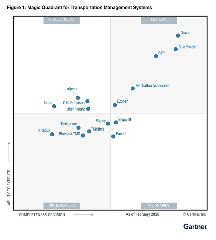 Gartner, “Magic Quadrant for Transportation Management Systems”; Brock Johns, Oscar Sanchez Duran, Manav Jain; 30 March 2026.