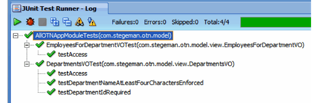 在 Oracle ADF 应用程序中编写 JUnit 测试最好从模型层开始。我们可以编写单元测试以确保相应的应用程序模块能够生成预期的视图对象实例, 并且检查我们的数据验证规则是否正确接受了有效数据并拒绝了非法数据。