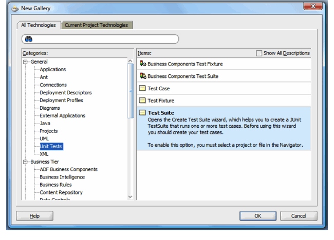 随着您向项目中添加多个测试类,您只需更新该测试套件的 @Suite.SuiteClasses 备注使其包含新创建的类。只需手动创建一个新类并添加批注,或者使用 Oracle JDeveloper JUnit Test Suite Wizard 创建类,您就可以创建更多测试套件。要调用该向导,您可以在 Application Navigator 中右键单击您的测试项目,然后单击 New...,在出现的 New Gallery 对话框中选择 Unit Tests 类别和 Test Suite 项(您可能需要选择 All Technologies 选项卡才能看到 Unit Tests 类别):