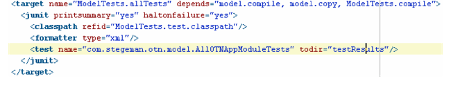 现在可以创建一个用于执行我们的测试套件的 Ant 任务了;用于 Ant 的 JUnit 插件将生成一个测试报告,因此我们需要先向 ModelTest 项目的 build.properties 文件添加一行来指定报告的输出位置:
