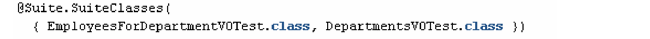 测试套件只是可以作为一个组一起运行的测试类的逻辑分组。ADF Business Component JUnit Wizard 为您生成一个测试套件,该测试套件对固件进行初始化并通过 @Suite.SuiteClasses 批注来指定由哪些测试类组成该套件: