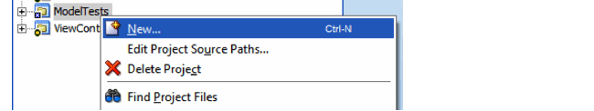 现在我们有了一个项目,可以使用 Business Components Test Suite Wizard 为我们的 Model 项目的 Oracle ADF Business Components 建立一组基本的 JUnit 测试,还可以建立一个 JUnit 测试固件(用于建立数据库连接)和一个 JUnit 测试套件(用于运行生成的测试)。为此,右键单击 ModelTests 项目,然后从上下文菜单中选择 New...: