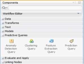只有连接到 Oracle 12c 数据库后,才会在作为 SQL Developer 一部分的 Oracle Data Miner GUI 中显示 Predictive Queries 选项。您将在 Components 窗口下看到 Predictive Queries 部分,如图 1 所示。