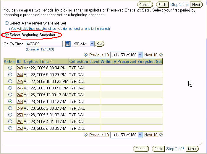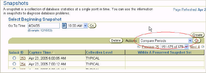 ![]() 注意红色椭圆内部的下拉框。选择“Compare Periods”,然后按“Go”按钮。这将显示一个屏幕,请选择第一个快照时段的结束时间,如下所示: