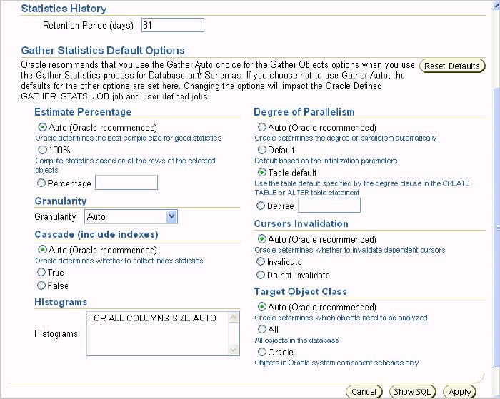 ![]() 单击该超链接将转到下个屏幕:Manage Optimizer Statistics 页面。