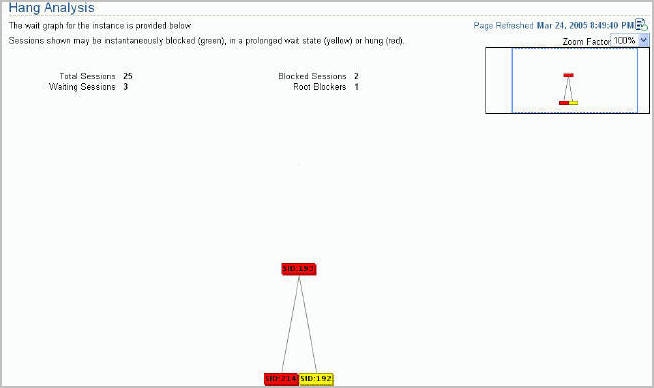 ![]() 该图展示了各种“死”会话。在该示例中,您可以看到 SID 为 193 的会话(根会话)已经阻止了其他两个会话,即 192 和 214。该图中的会话颜色表示会话受阻的时间。可以单击 SID 访问 Session Details 屏幕,以获取更多信息。 还记得 ORADEBUG 实用程序吗?Oracle 企业管理器使用该实用程序获得有关系统挂起的数据。启用 SGA 直接连接时,Oracle 将对每个实例使用一个 SQL 收集器。该收集器随企业管理器自动启动。检索到以下视图中的数据: V$SESSION V$SESSION_WAIT V$SYSTEM_EVENT V$SYSSTAT附连内存的 SGA 查询是一个非常强大的特性,以后肯定能帮您解决棘手问题。我们都对可“征服”数据库的应用程序有一种亲切感,为什么呢?现在,您可以给出答案了。我认为此特性是第 2 版一个最适用于数据库管理员的特性。