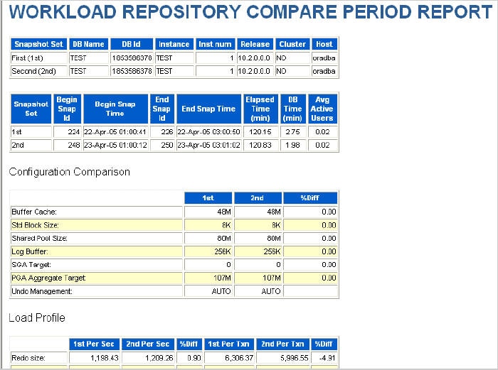 ![]() 注意,您可以看到每个时段的开始时间和结束时间。第一列显示从其他列收集或计算的不同量度;随后几列显示这些度量在每个时段的值。这些度量提供了您为找到性能差别而搜索的线索。 您可以通过单击 Second Period Rate Per Second 列(这将对它的输出进行排序)使该操作更为简单。从高到低的顺序开始,这将在顶部显示最差的值。在您的示例中,假设它表明物理读取次数在第二个时段很高。问题解决了:您现在知道为什么已用的时间很高了。要了解导致物理读取次数增加的原因,您可以生成一个所有活动和所有量度(类似于 AWR 报表,但由于作为比较报表,因此并不针对特定时段)的报表。单击 Report 选项卡,您将看到类似以下屏幕的报表: