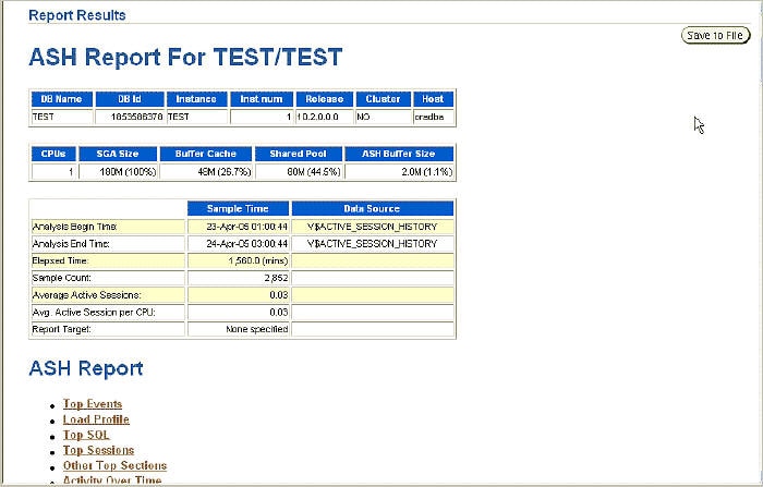 ![]() 可以按按钮“Save to File”将该报表保存到文件,以便以后查看。 注意“ASH Report”部分中的链接。在此处,您可以全览不同类型的与性能相关的可用统计信息。例如,您只需单击 Top Events 链接便会看到该时段中的最重要事件。如果该时段出现性能问题,该信息将为您提供很大的帮助。通过查看 ASH 报表中列出的各个维度的偏差,您通常可以确定导致瞬时尖峰的瓶颈。 注意,该报表是根据相应的从 AWR 收集的或从内存中缓冲区提取的数据而得出的;因此,如果要诊断先前出现的性能问题,只需激活该时段的 ASH 报表便会看到任何可能已经出现的问题。 也可以通过命令行运行 ASH 报表,方法是运行位于 $OH/rdbms/admin/ashrpt.sql 中的由 Oracle 附带的 SQL 脚本。