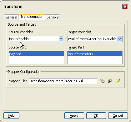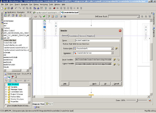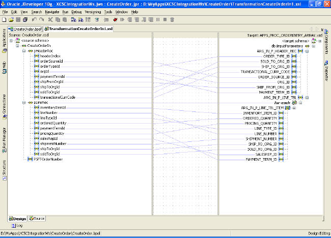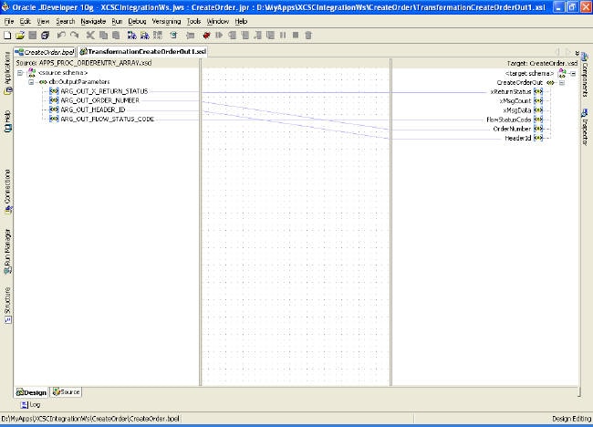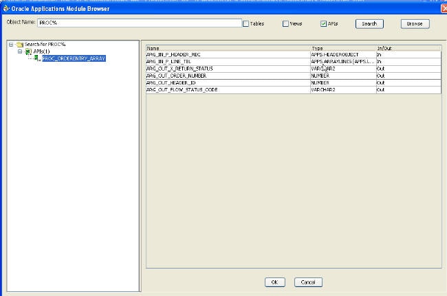 注意:在本示例中,由于 BPEL 流程管理器将不支持 oracle 记录类型,因此 PROC_ORDERENTRY_ARRAY 是为 PROCESS_ORDER 预先提供的 API 编写的包装器 API。您将改用包装器过程中的对象类型(类似于 PROCESS_ORDER 中使用的记录类型)。此接口负责处理 Oracle 应用程序中的销售订单。