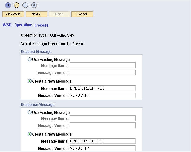 单击 Next 按钮前进到 WSDL Operation Wizard 的下一页,在该页中为服务选择请求消息和响应消息。请求和响应消息是在 PeopleSoft 中创建的用于表示 SOAP Request 和 Response 消息的非结构化消息。 创建一个新的请求或响应消息: