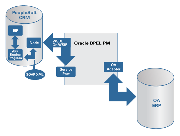 图 2 企业集成点 (EIPS) 是使 PeopleSoft 应用程序能够与第三方系统和其他 PeopleSoft 软件无缝工作的 Web 服务连接。在 PeopleSoft CRM 中提交订单时,PeopleSoft 中的 EIP 将它转换为 XML 格式。随后,将该订单 XML 传递给附加的 PeopleCode 方法 ( WSDL_ORDER)。(PeopleCode 是用于实施业务规则或执行其他自定义的 PeopleSoft 编程语言。) WSDL_ORDER 将把收到的订单 XML 转换为 SOAP XML 并将该请求发送给 PeopleSoft 远程节点。 远程节点 是与在 BPEL 流程管理器中配置的 Web 服务握手的节点。 可以通过使用 Web 服务调用框架 (WSIF) 绑定(BPEL 流程管理器为其提供了强有力的支持)将远程节点映射到 WSDL 来调用 Web 服务。在收到此 SOAP XML 时,PeopleSoft 节点将根据为该节点导入和配置的 WSDL 来调用 Web 服务。此 Web 服务在 BPEL 流程管理器中调用和执行。 BPEL 流程管理器将订单数据作为 SOAP XML 处理并将它发送给 Oracle 应用程序;它在内部利用 Oracle 应用程序 (OA) 适配器 与 11i 通信。OA 适配器是一个纯 JCA 1.5 资源适配器,用于从电子商务套件中发送和接收消息。Oracle 应用程序通过此适配器将某个提供的 API 和表公开给外部应用程序。 Oracle 应用程序处理订单并发送确认;BPEL 流程管理器接收该响应并将它转发给 PeopleSoft 节点。随后,该节点将响应请求 Web 服务的 PeopleCode。后者将检索 XML 数据并将它提交给 PeopleSoft 中配置的组件接口。 组件接口 是公开 PeopleSoft 组件以便从其他应用程序(用 Java 或 PeopleCode 编写)中进行同步访问的接口。 它是订单数据从 PeopleSoft 发送到 Oracle 应用程序并返回的高级流。在下一个部分中,您将了解如何将 PeopleSoft CRM 模块公开为 Web 服务、如何构建一个 BPEL 流程以及如何配置 OA 适配器。 将 PeopleSoft CRM 与 Oracle ERP 集成在 PeopleSoft CRM 中提交订单后,需要将订单信息传递给 Oracle 应用程序。该流程有三个主要步骤。