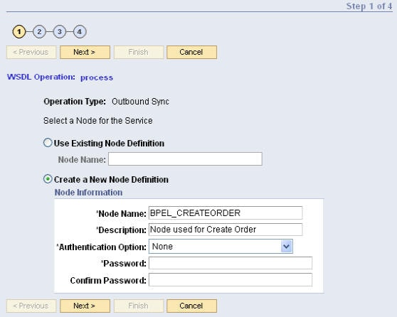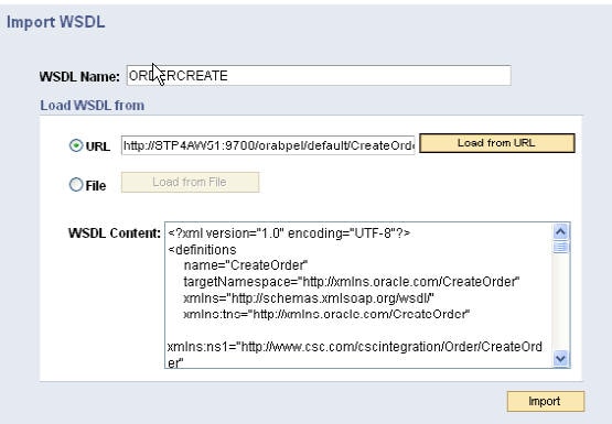下面我们将详细介绍其中的每个步骤。 1. 配置 PeopleSoft 节点以便与 BPEL 流程进行交互在该步骤中,您将配置一个节点来与 BPEL 流程交互。您将定义请求和响应消息以及这些消息将通过的通道。 首先,使用 URL 选项将 CreateOrder.wsdl(先前创建的)导入到 PeopleSoft 中。这将 CreateOrder 标识为流程(在 PeopleSoft 中创建订单时将调用该流程)。将 WSDL 导入到 PeopleSoft 中时,集成代理程序将把它添加到 WSDL 信息库中。 要导入 CreateOrder.wsdl,选择 PeopleTools > Integration Broker > Web Services > Import WSDL。