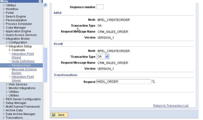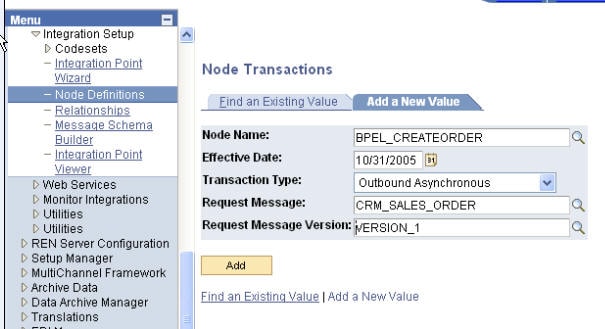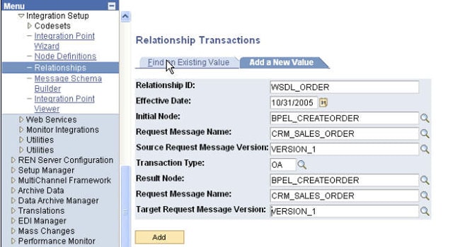 4. 将 WSDL_ORDER 应用程序引擎与节点链接 在该步骤中,您将把转换代码关联到 CreateOrder 节点。因此,每当调用 BPEL 流程管理器时,将执行该转换节点。 创建一个新的关系 WSDL_ORDER,并将它映射到节点 WSDL_ORDER。为此,执行以下操作: 从 People Tools > Integration Setup 中选择 Relationships 并选择 Add New Value。
