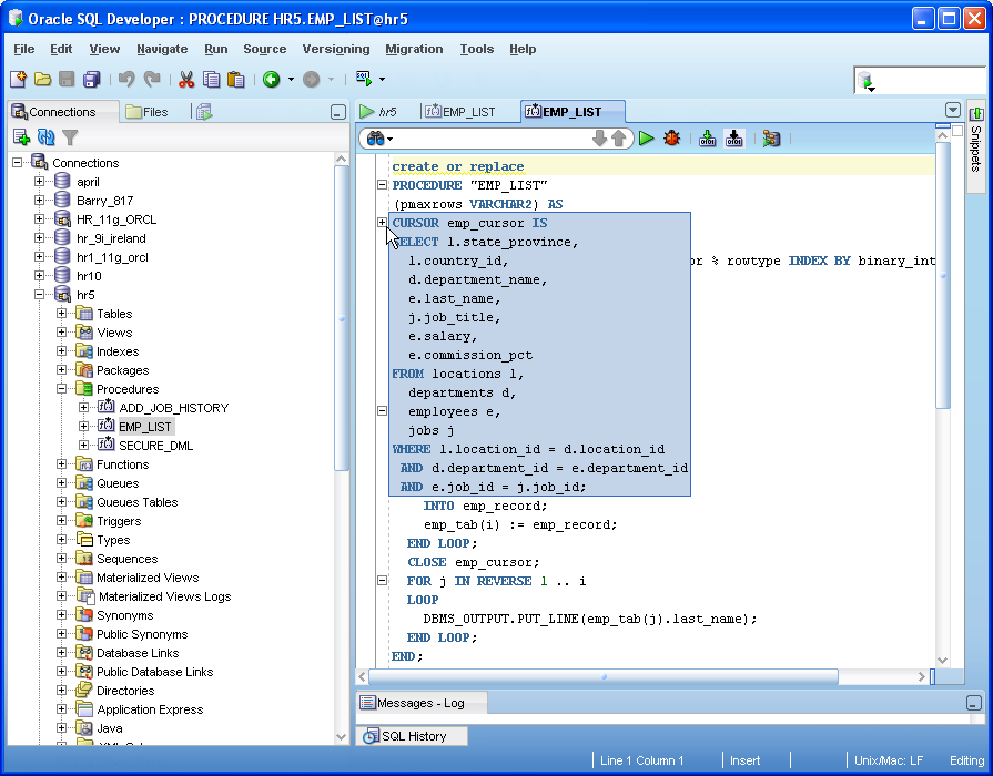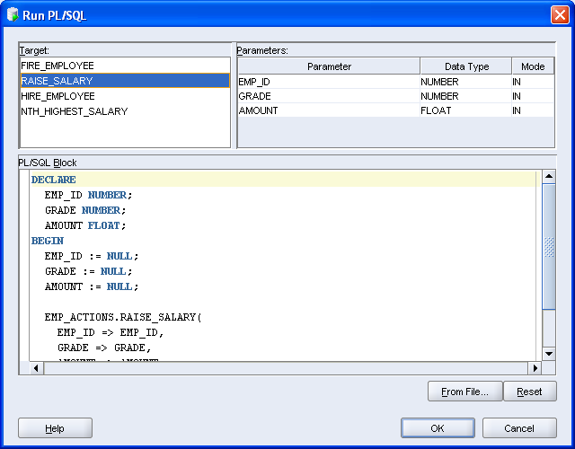 所有打开的 .pks、.pkb 和 .pls 文件将在 PL/SQL 代码编辑器中打开。用户可以编辑、使用代码片段,编译并保存这些文件。