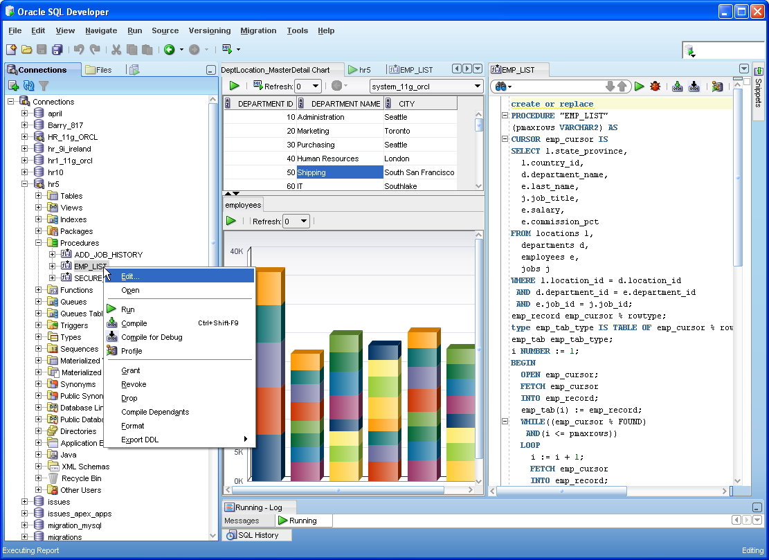 大多数提供的报表都包括点击方式。如果用户单击结果行,将显示该行中对象的定义。还可以将任一报表的 SQL 拖进工作表,对其进行编辑,然后存储为您自己的自定义报表。