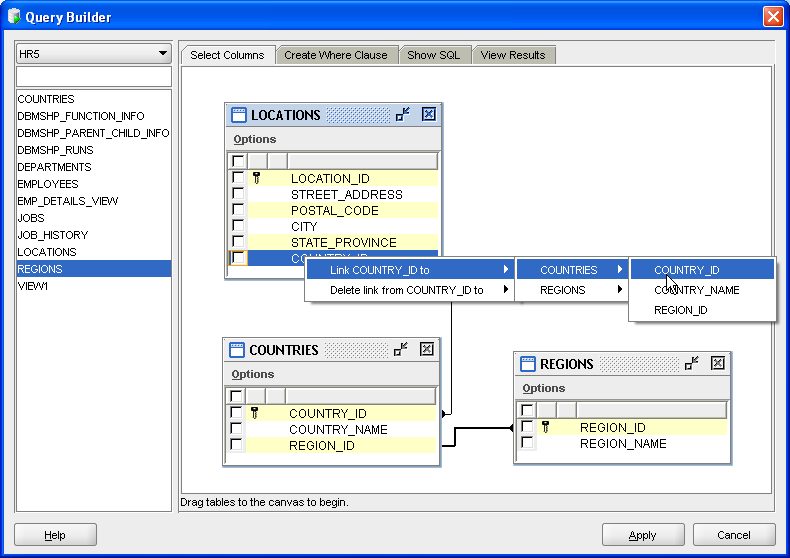 使用查询创建器可以通过拖放操作快速创建 SQL 查询、选择表以及通过单击鼠标选择列。