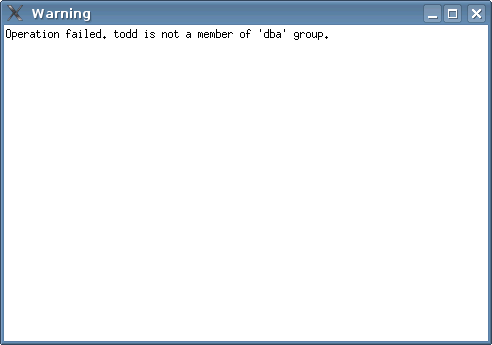 答:用户 “todd” 不是 “dba” 组的成员。您可以导航至 System Settings,使用管理模式 添加用户 “todd” 至 “dba” 组,从而添加该用户。