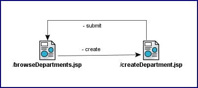 OperationBinding operationBinding = bindings.getOperationBinding("removeEntity"); Object result = operationBinding.execute(); 此外,要调用查询操作方法绑定,需要将类似代码添加到方法中。 将以下代码复制并粘贴到托管 bean 的 Object result = operationBinding.execute(); 语句下方,并使用表的查询方法名替换 findAllDepartments: //Refresh the page OperationBinding requery = bindings.getOperationBinding("findAllDepartments"); requery.execute(); 使用会话 bean 数据控件插入行 将创建功能添加到插入页 执行以下步骤使用构造函数创建新行: - 在可视编辑器中导航到插入页,并确保表单包含一个 Submit 按钮。