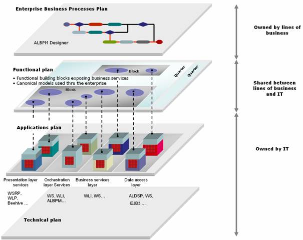 此规划侧重于业务战略环境中的业务流程。企业架构师从业务战略定义的业务需求入手,与组织中的不同业务线紧密合作,从而为大型企业业务流程建模。例如,企业架构师可以使用 AquaLogic BPM Designer 在设计层面实现这一目的。这将有助于架构师理解企业内全局的主要流程,并将通过让更多的业务代表参与进来以推进这种方法的实施。使用 AquaLogic BPM Designer,业务分析师可以模拟业务流程,从而度量对流程进行反向工程时发生的优化。业务流程规划归业务所有。架构师的主要任务是捕获业务需求并识别可由组织内不同业务线使用的通用业务服务。