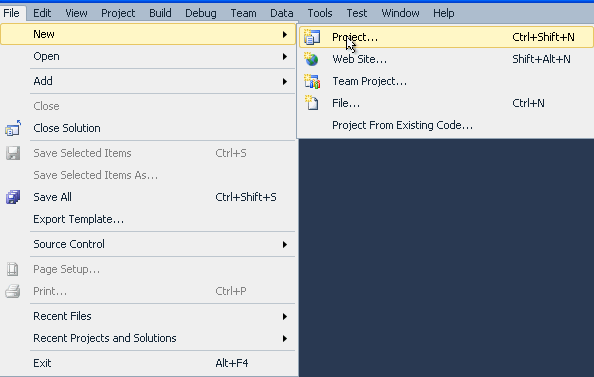 要创建一个新的 .NET 控制台应用程序来运行 Entity Framework 和 LINQ 应用程序表单,请打开 Visual Studio。单击 File。选择 New> Project。 |