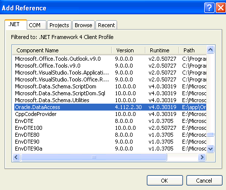在 .NET 选项卡页面中,选择 Oracle.DataAccess 和 System.Data.Entity 第 4 版程序集并单击 OK。