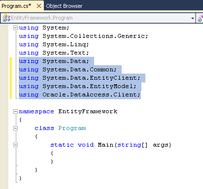 键入下图中高亮显示的命名空间引用。或者,您也可以复制并粘贴该信息。从您的工作目录中打开包含 Programcs.txt 的文件夹。然后,复制包含命名空间引用的代码,并粘贴到 Program.cs 的顶部。 通过这些指令可以访问 ODP.NET、ADO.NET 和 Entity Framework 命名空间。