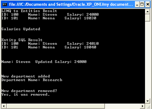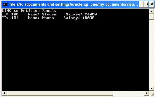 显示 LINQ 查询的输出,这表示已成功执行对 Oracle 数据库的 LINQ 查询。