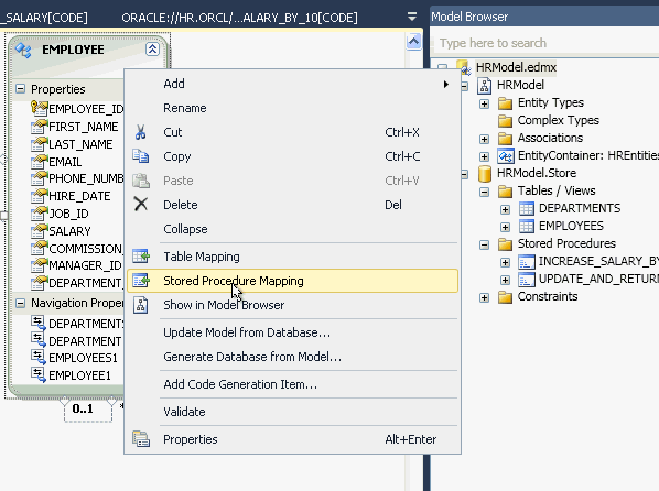 在 HRModel.edmx 中,右键单击 EMPLOYEE 实体并选择 Stored Procedure Mapping。