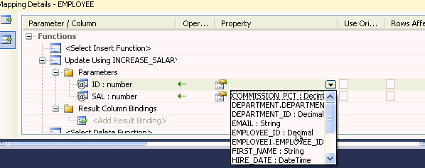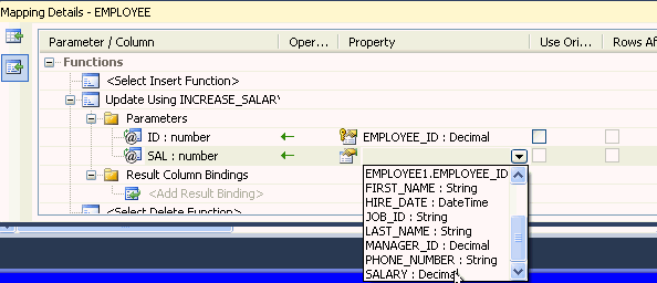 在 Mapping Details - EMPLOYEE 窗口中,选择 <Select Update Function>,然后选择 INCREASE_SALARY_BY_10 存储过程。