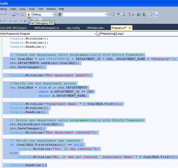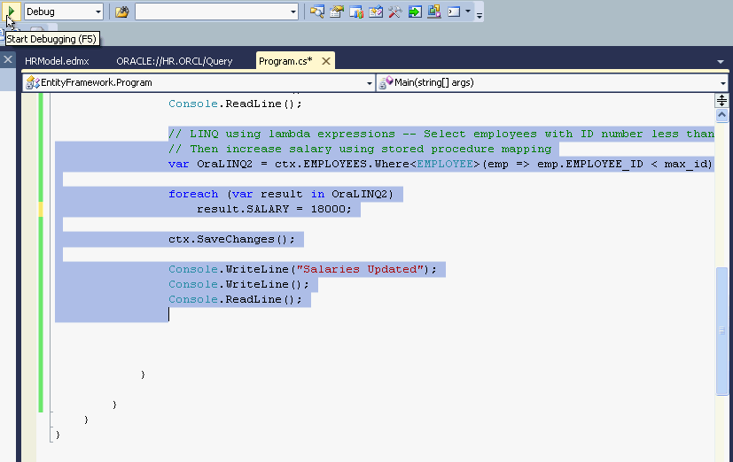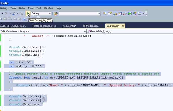 键入以下 .NET 代码。这些代码对刚创建的 EDM 执行一个 LINQ 查询。然后访问结果并输出到屏幕上。该 LINQ 查询检索所有 EMPLOYEE_ID 值小于 max_id 变量的员工信息。 也可以从 Programcs.txt 中复制 LINQ 查询代码并粘贴到 Program.cs 的 Main 语句后面。确保用一个右花括号来结束 USING 代码块。