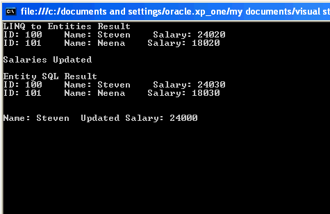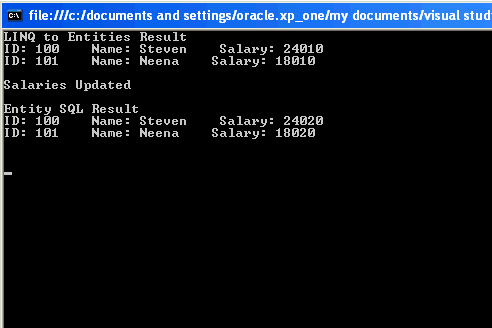 LINQ 检索这两行数据,并通过执行上述存储过程更新这两行数据。文本显示工资已经更新。