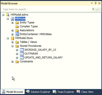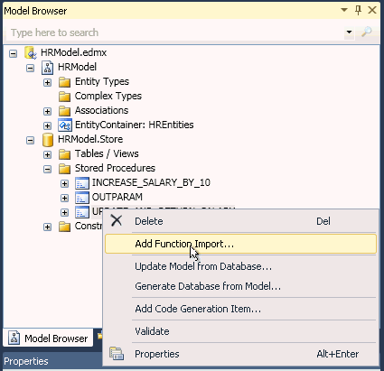 在 Model Browser 中,您将看到 UPDATE_AND_RETURN_SALARY,它位于 HRModel.edmx > HRModel > EntityContainer:HREntities > Function Imports 下面。