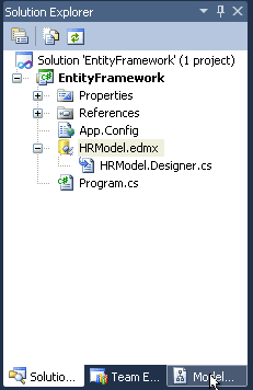 首先,创建一个用于更新数据的存储过程。当 .NET 尝试更新数据时,映射的存储过程将对 LINQ 选取的每行执行更新。 在 Solution Explorer 窗口中,选择 HRModel.edmx 并单击 Model Browser。