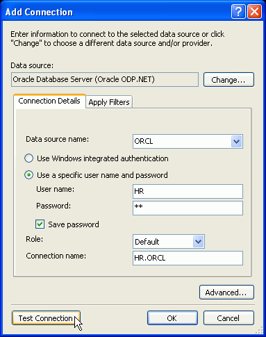 如果您还没有 HR 连接,则在 Server Explorer 中右键单击 Data Connections。选择 Add Connection,然后选择一个包括 HR 模式的 Data source name,例如,ORCL。在 User name 和 Password 中输入 HR。选中 Save password。选择 Default 作为 Role,然后单击 Test Connection。