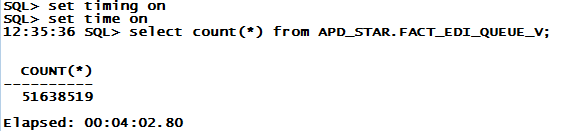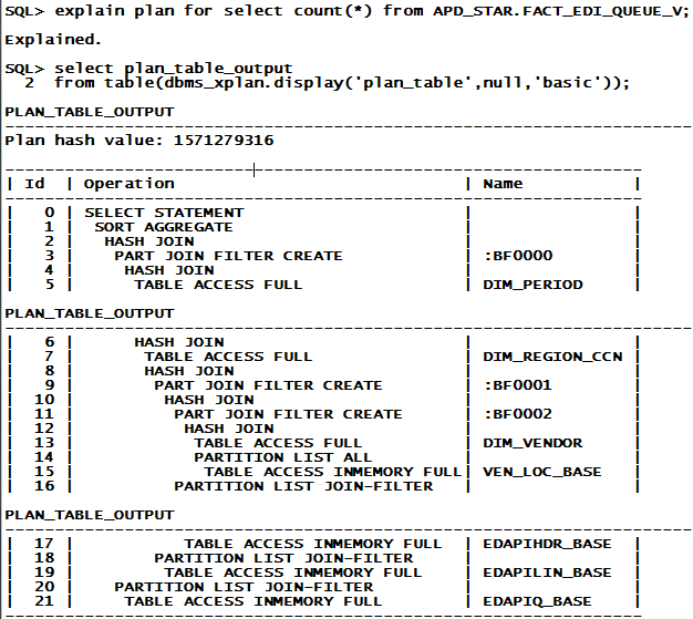 Revisando la definición de la vista física FACT_EDI_QUEUE_V, encontramos cuatro tablas físicas grandes en base a las cuales la vista está construida: EDAPIHDR_BASE , EDAPIQ_BASE , EDAPIQ_BASE VEN_LOC_BASE. A través de la vista, la consulta SQL asociada a ésta,produce operaciones de “full table scan” sobre estas cuatro tablas. Decidimos entonces colocar las mismas dentro del “Oracle Database In-Memory area”.