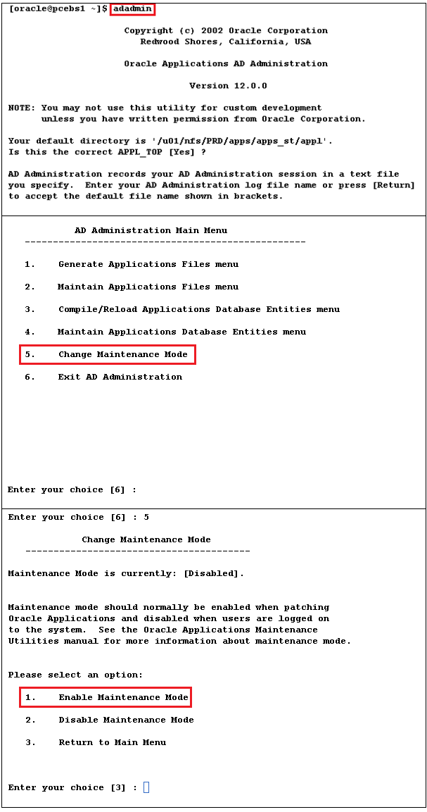 Para configurar en modo mantenimiento debemos ejecutar el utilitario adadmin. A continuación se presentan la secuencia de pasos a seguir.