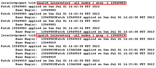 El utilitario opatch tiene la opción lsinventory -all_nodes que nos permite validar si el parche está instalado en todos los nodos que conforman el clúster siendo esta opción ejecutada en cualquier de los nodos.