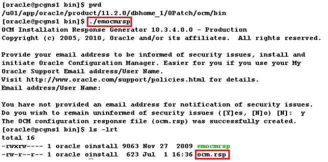 Este archivo se crea ejecutando el utilitario emocmrsp el cual se encuentra en la carpeta: <ORACLE_HOME>/OPatch/ocm/bin/.