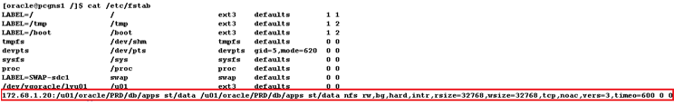 172.68.1.20:/u01/oracle/PRD/db/apps_st/data /u01/oracle/PRD/db/apps_st/data nfs rw,bg,hard,intr,rsize=32768,wsize=32768,tcp,noac,vers=3,timeo=600 0 0